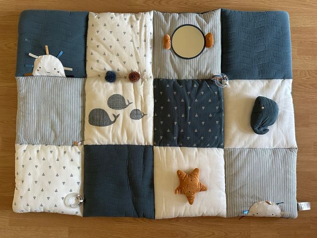 Detalles del productoAlfombra de actividades para bebés con múltiples texturas y elementos interactivos.