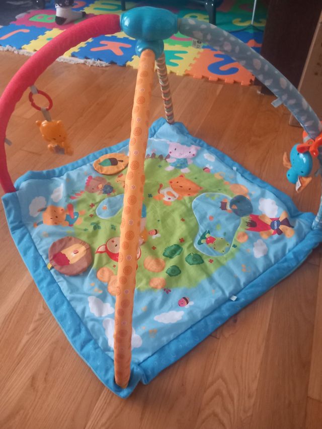 Detalles del productoAlfombra de actividades para bebés con arco de juegos y juguetes colgantes.