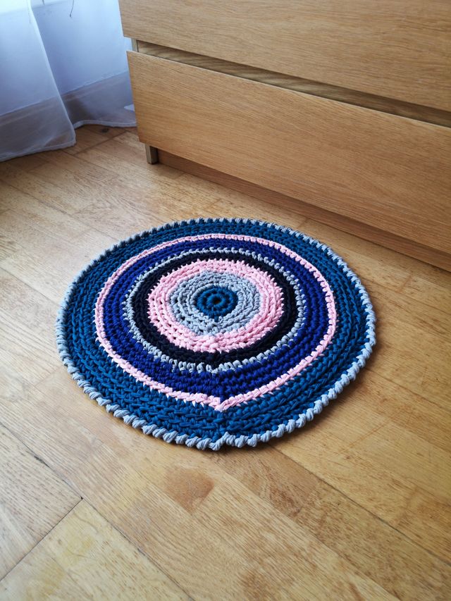 Alfombra hecha a mano con trapillos nuevos (no reciclados) de 54 cm de diámetro. Decora tu hogar con un toque especial y único. Hago envíos.