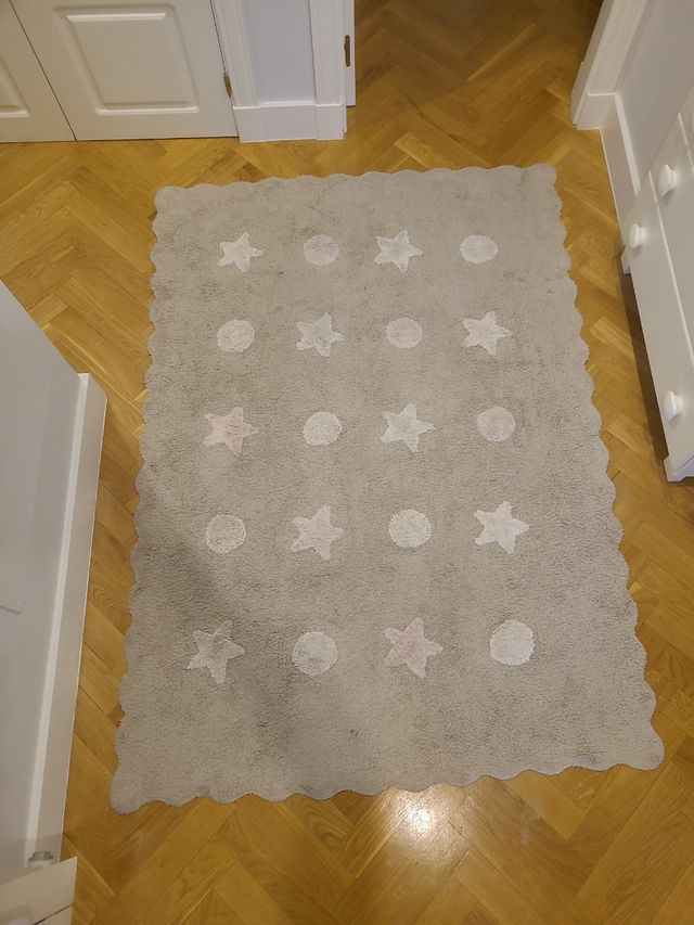 Detalles del productoEn perfecto estado. Además,se puede lavar en lavadora. es gris clarito con estrellas y círculos en blanco y rosa muy clarito.