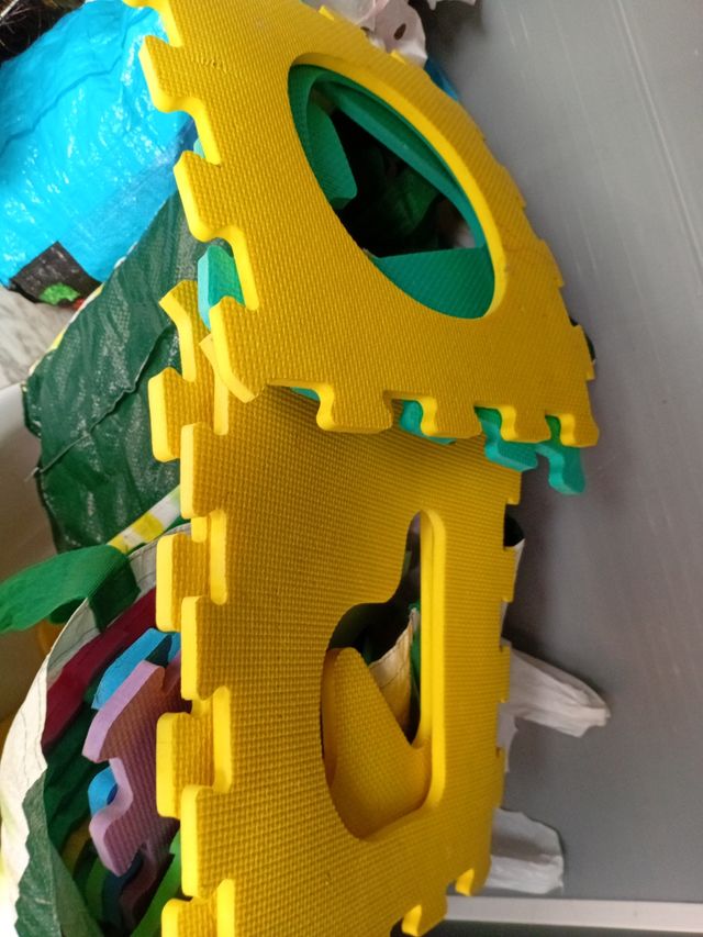 Alfombra de piezas con diseño de abecedario para el suelo. - Piezas con borde de puzzle. - Textura de corcho y goma.
