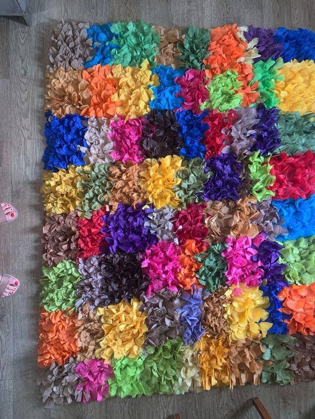 Alfombra tejida en cuadrados con flores multicolor