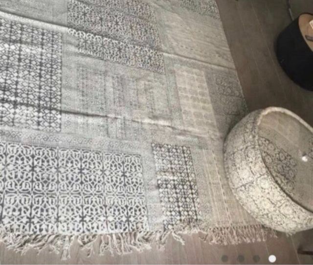 La alfombra mide 2 m 10 cm de largo y 1,52 cm de ancho, el Puff es de algodón mide alto 33 cm x 64 profundo x 64 ancho es grande Precio no negociable, vale la alfombra sola 165€ y el Puff 99€ el botón está un poco descosido del Puff y hay que limpiarlo por la parte del suelo. Vendo alfombra por separado por 100€