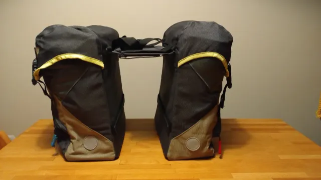 Par de alforjas para bicicleta Decathlon, ideales para llevar equipaje. - Prácticamente para estrenar -Se adaptan con velcro a cualquier trasportin. - Cuentan con elementos reflectantes circulares.