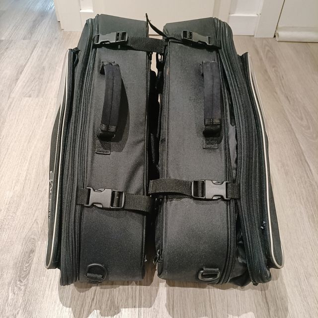 Detalles del productoSe venden alforjas laterales de moto Bagster. Son dos alforjas de color negro con detalles plateados. Se puede ampliar el espacio.