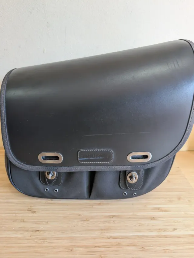 Alforjas laterales de cuero para moto Triumph Bonneville. - Material: Cuero. - Color: Negro. - Cierre con candado.