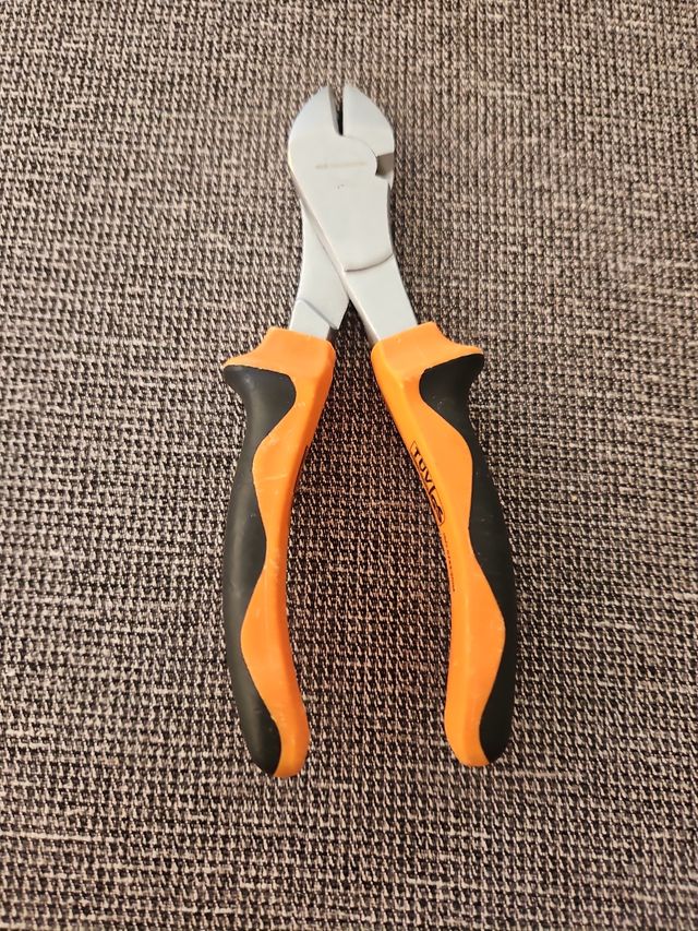 Alicates de corte en buen estado. - Mangos de color naranja y negro. - Acero inoxidable. - Ideales para trabajos de precisión.