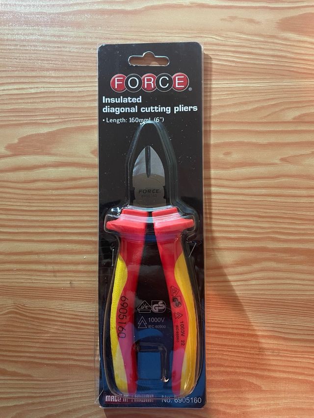 Alicates de corte diagonal FORCE, diseñados para trabajos con aislamiento. - Longitud: 160 mm (6 pulgadas). - Certificación 1000V IEC 60900.