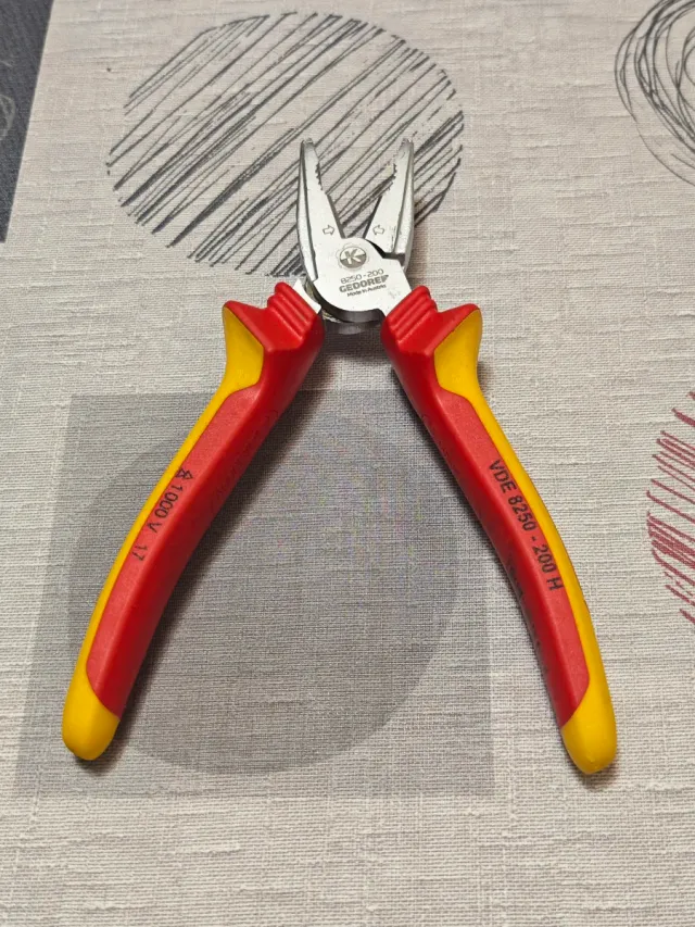 Alicates de alta calidad de la marca Gedore. - Modelo: VDE 8250-200 H. - Diseñados para trabajar con hasta 1000 V. - Mango ergonómico en rojo y amarillo.