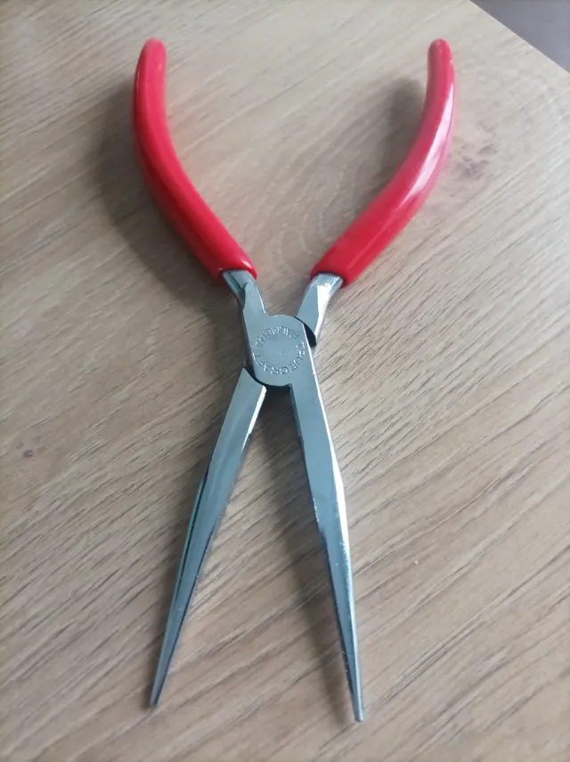 Alicates de punta larga de la marca Palmera. Chrome Vanadium. Trabajos de precisión. Mango de color rojo. Referencia K408G