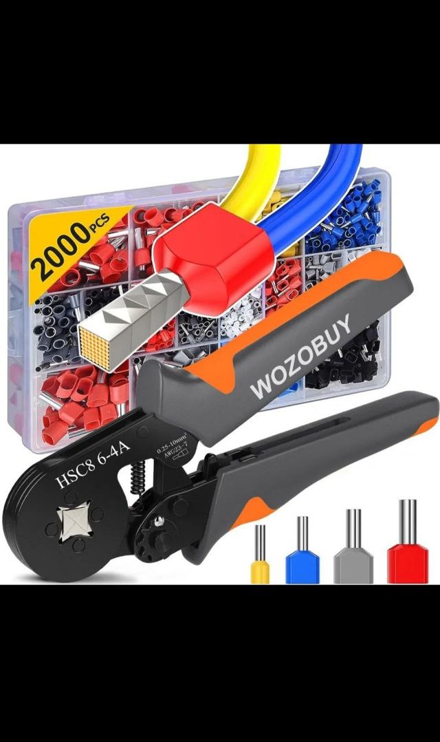 Detalles del productoHerramienta para prensar terminales y punteras eléctricas. Incluye una caja con 2000 piezas de terminales de diferentes colores y tamaños.