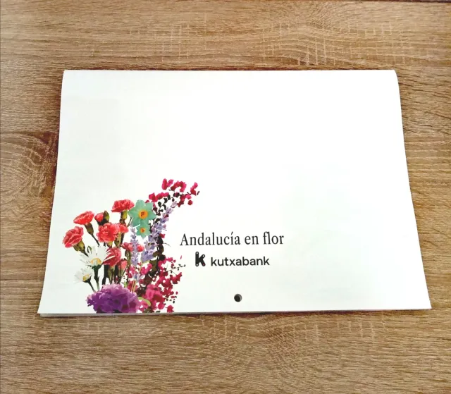 Detalles del productoAlmanaque del banco Kutxabanc (Banco Cajasur) con flores típicas andaluzas para el año 2026. Es el típico almanaque grande que se cuelga en la pared, ya que tiene un agujero en el centro para esa misma función.