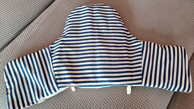 Almohadilla para trona con un diseño de rayas azules y blancas. Es cómoda y práctica. - Tejido de algodón. - Cierre de cremallera. - Dos cintas de sujeción.