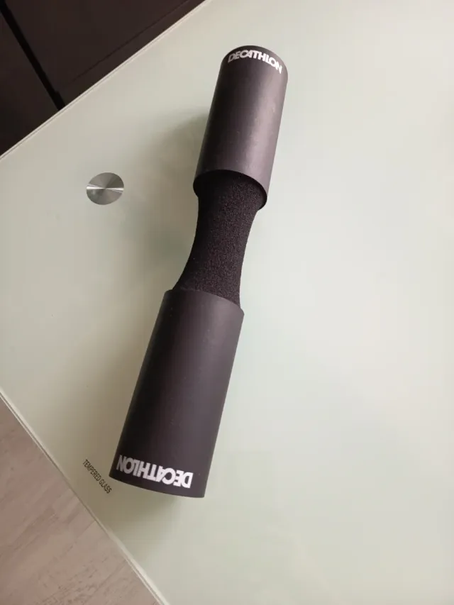 Detalles del productoProtector de barra para ejercicios de gimnasio, marca Decathlon. Diseñado para ofrecer comodidad durante el levantamiento de pesas.
