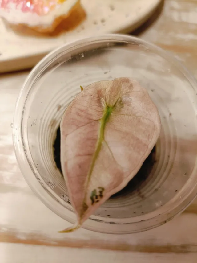Planta Alocasia Polly Pink Variegata con hoja rosada y verde una monada no te quedes sin ella muy cute - Hoja con patrón variegado. - Vena central verde marcada.