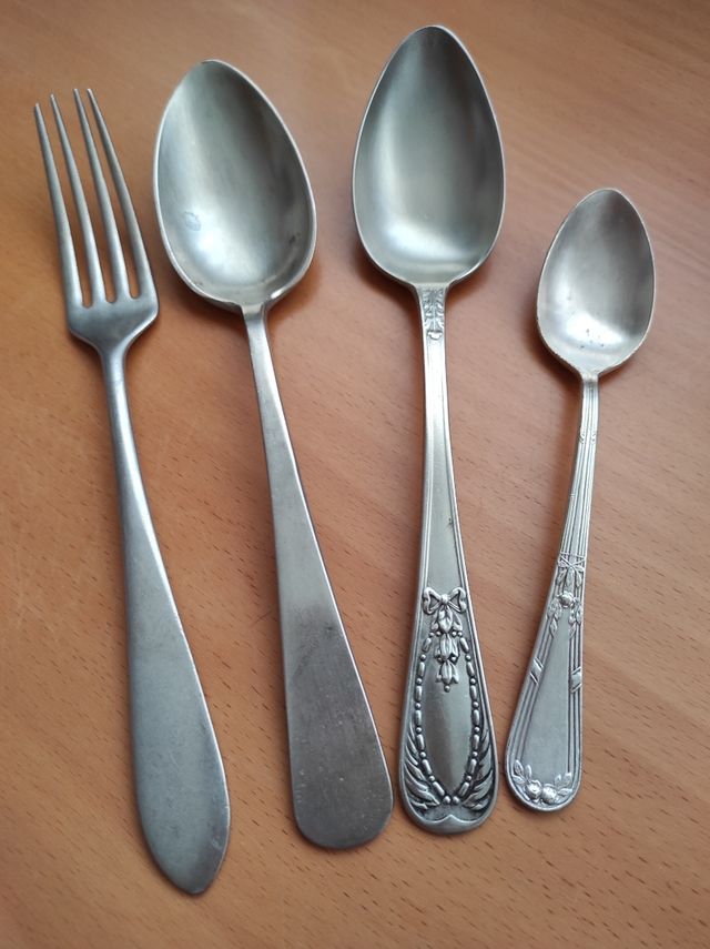 Tres cucharas,dos soperas y una de postre y un tenedor todo antiguo de alpaca con el sello por detrás mirar fotografías