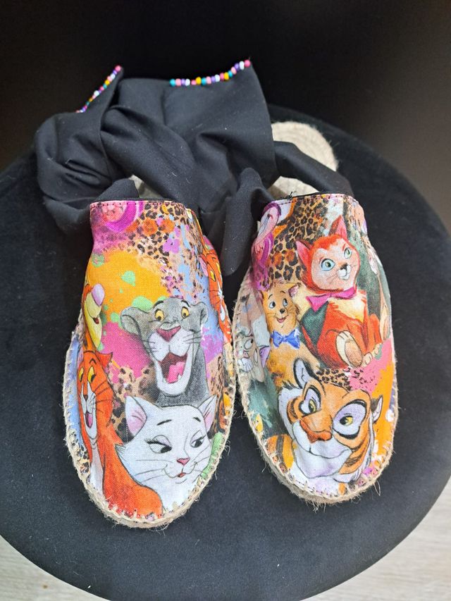 alpargatas de estampado de felinos de disney. número 39. medida de la suela 25 cm. con lazos para anudarlas al tobillo. sin estrenar.