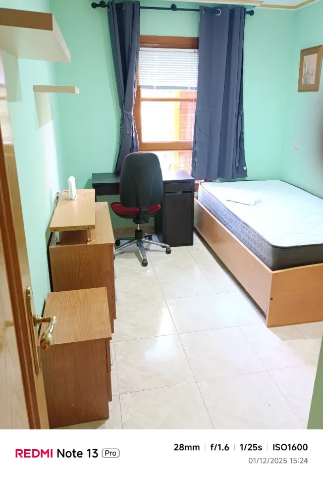 Detalles del productoHabitación totalmente a estrenar con escritorio, triple protección en la ventana, colchón nuevo de 30 cm de altura y 105 de ancho, así como funda, somier, persianas etc etc.nuevos. Frigorífico individual, cocina con todos los utensilios necesarios incluido freidora de aire etc etc.dos cuartos de baño y uno de aseo así como jardín a ambos lados. A tres minutos del Supercor, Ahorramás y todas las paradas de bus y circular, Ambiente agradable y familiar. Todos los gastos incluidos, wifi, agua, luz, productos de limpieza.......