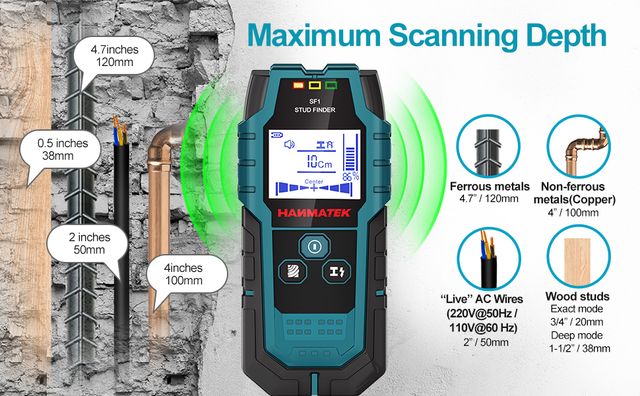 Simple y fácil de usar: el escáner de pared SFI tiene 4 funciones, es adecuado para detectar metal, madera, magnetismo, cables de CA, puede fijar con precisión y rapidez la posición de clavos, tornillos, barras de acero, vigas de madera, cables de CA, etc.