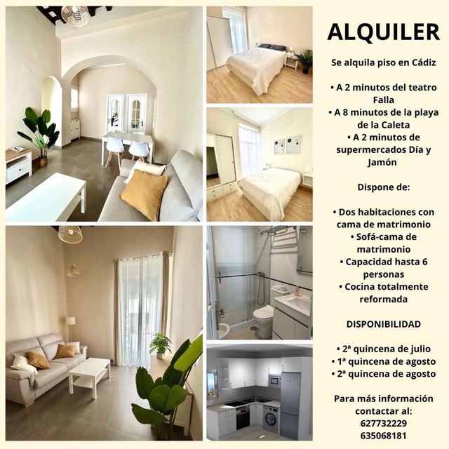 Detalles del productoPrecioso apartamento en Cádiz, a 2 minutos del teatro Falla y a 8 minutos de la playa de la Caleta. A 2 minutos de supermercados Día y Jamón.