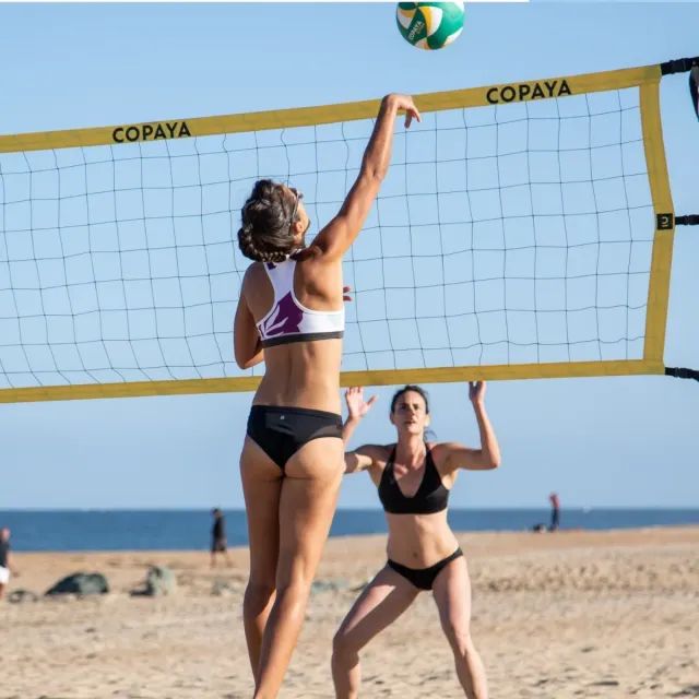 Montaje en arena: clavar piquetas, tensar cuerdas y ajustar altura en los postes. Revisar la tensión de la red durante el juego y sacudir la arena al devolver.