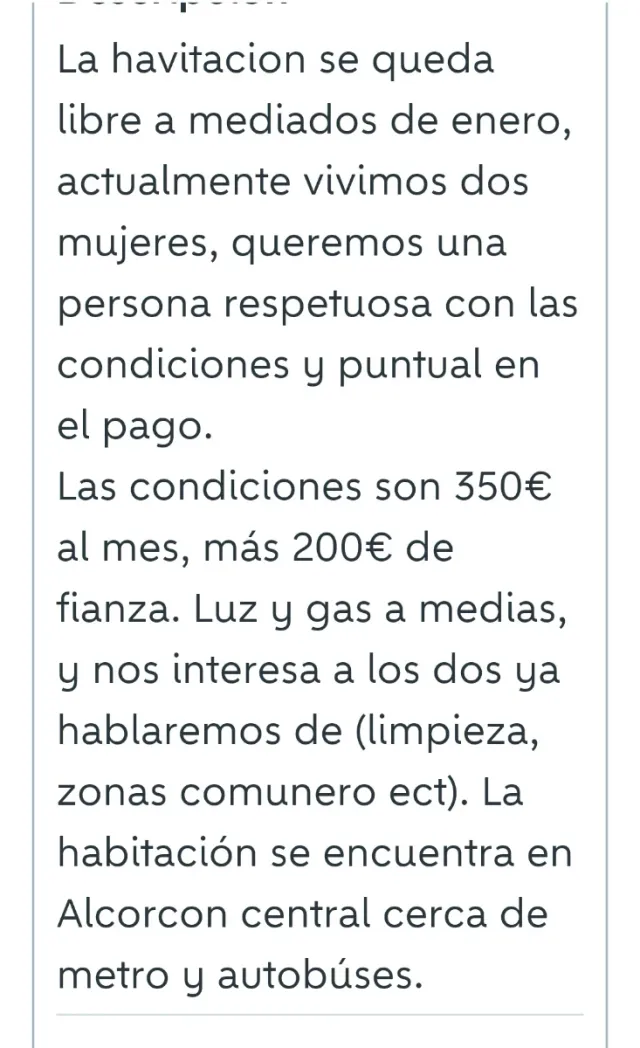 Detalles del productoAlquilo habitación para 1 persona, que actualmente se encuentre trabajando y que sea cordial y correcta en los pagos, la casa se encuentra cerca de todo tipo de trasporte y si nos conviene a los dos ya hablaremos de los sitios comunes y limpieza, actualmente vivimos dos mujeres se alquila por 350€ más 250 de fianza.