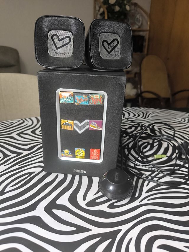 Detalles del productoAltavoces para PC con un diseño único inspirado en Bob Marley. Incluyen dos altavoces satélite y una unidad central.