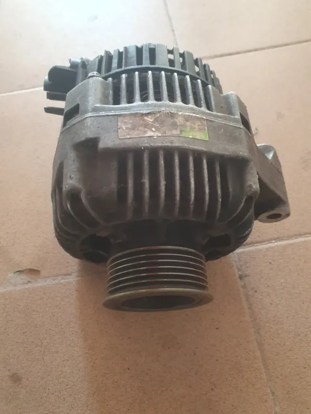 Alternador para coche, pieza esencial para el sistema eléctrico. - Carcasa metálica con aletas de refrigeración. - Polea con estrías para correa. - Conector de varios pines.