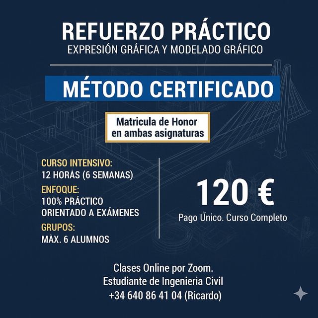 Soy Ricardo, estudiante de Ingeniería Civil en la UPV. Ofrezco un sistema de alto rendimiento para superar las asignaturas de Expresión Gráfica y Modelado Gráfico en primer curso.