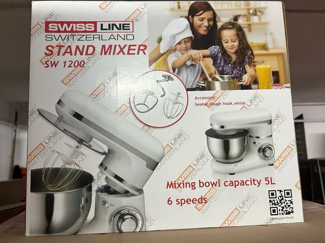 Amasadora de pie SWISS LINE modelo SW 1200. - Capacidad del bol: 5 litros. - 6 velocidades. - Accesorios incluidos: batidor, gancho para amasar y varillas.
