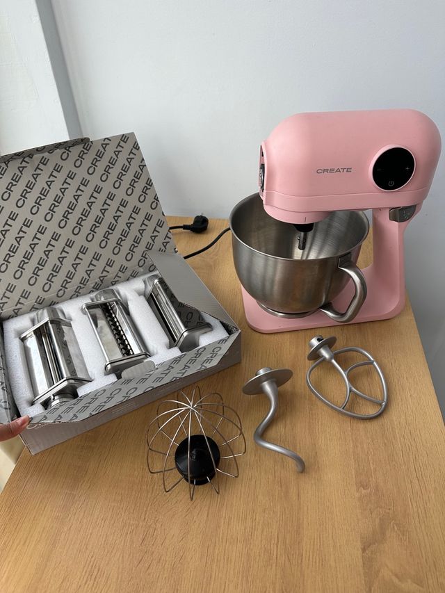 Detalles del productoAmasadora eléctrica de la marca Create en color rosa, ideal para preparar masas, postres y pasta. Funciona muy bien!