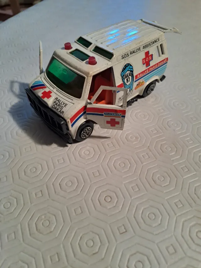Réplica de ambulancia de juguete de la marca Guisval, modelo Rally Dakar 87. - Diseño detallado con motivos de rally. - Puertas abatibles. - Luces superiores.