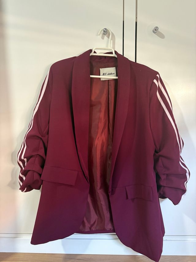 Americana en color burdeos. Presenta un diseño moderno con rayas en las mangas.