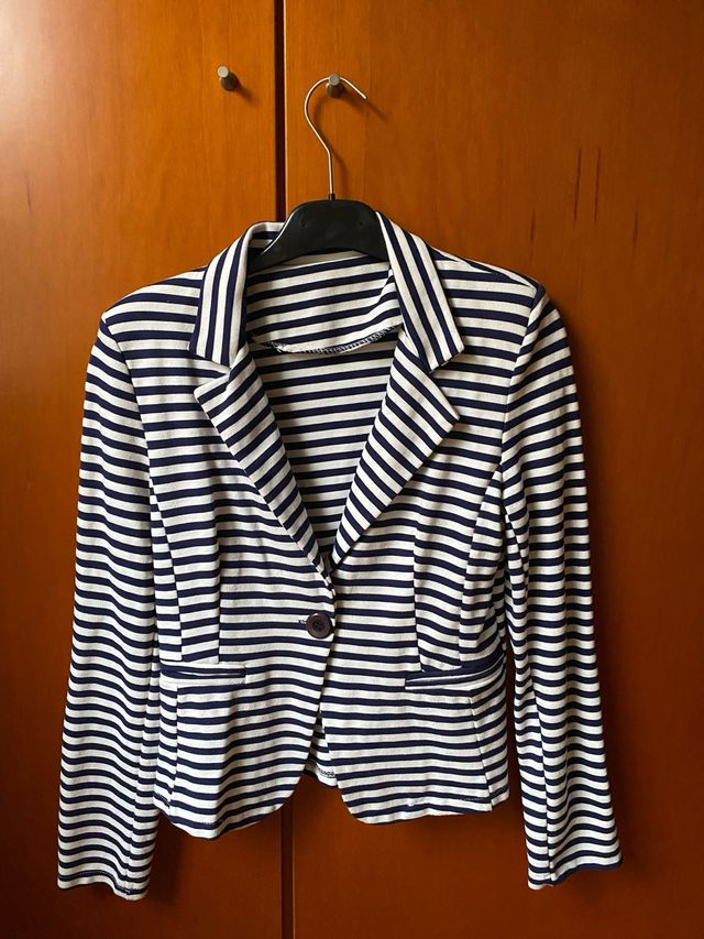 Elegante americana de punto con un diseño de rayas clásico. Es una prenda versátil y cómoda.