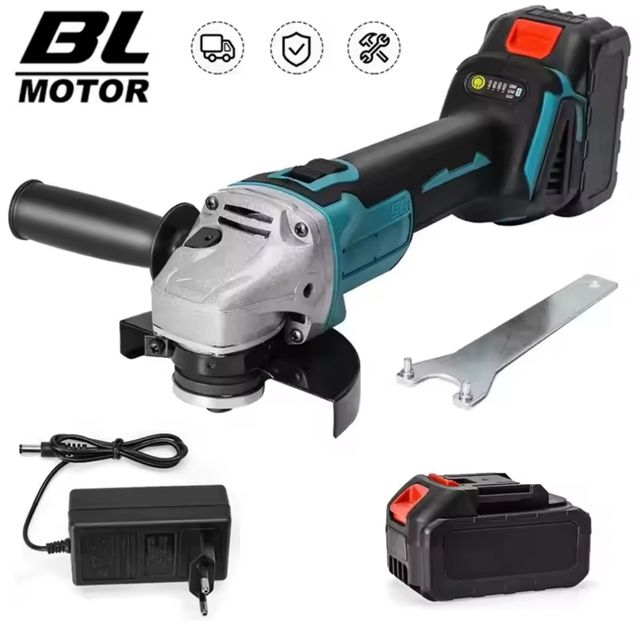 Amoladora angular a batería con motor BL. - Incluye cargador y batería de doble celda. - Llave de montaje.