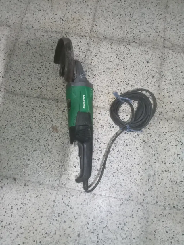 Amoladora angular de la marca Hitachi en color verde. Incluye cable de alimentación. - Mango auxiliar. - Protector de disco.