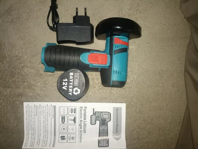 Detalles del productoAmoladora angular portátil con batería de litio de 12V. Incluye cargador y manual de instrucciones.