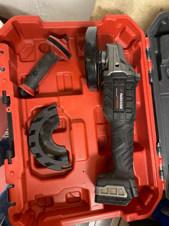 Amoladora Parkside en su maletín original. - Incluye amoladora. - Mango auxiliar. - Protector de disco. - Maletín de transporte rojo.