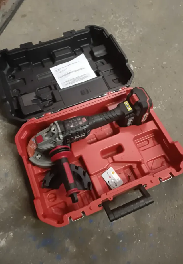 Amoladora angular Parkside Performance en su maletín. - Incluye amoladora y maletín. - Mango auxiliar. - Batería y cargador no incluidos.