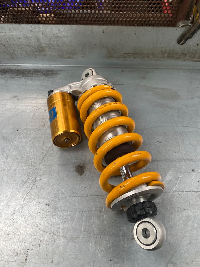 Detalles del productoAmortiguador trasero de la marca Ohlins, compatible con Ducati Hypermotard. Presenta un muelle de color amarillo y un depósito de expansión dorado.