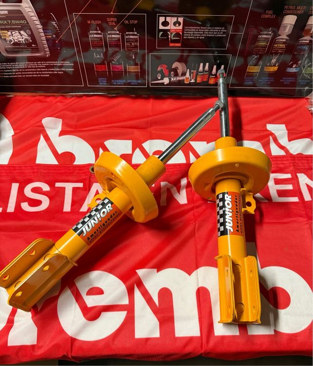Detalles del productoAmortiguadores deportivos de la marca Junior, compatibles con Opel Astra G. Son de color amarillo brillante.
