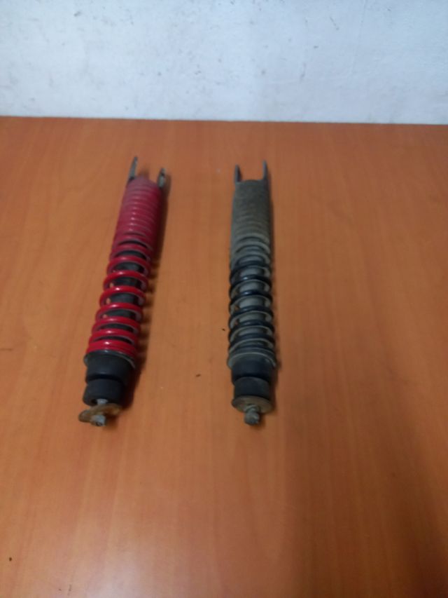 Dos amortiguadores para Piaggio Vespa. - Amortiguador delantero rojo. - Amortiguador trasero negro.