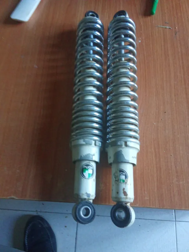 Pareja de amortiguadores traseros para Puch Borrasca. Se venden juntos. - Color blanco y plateado. - Incluyen logo de la marca.