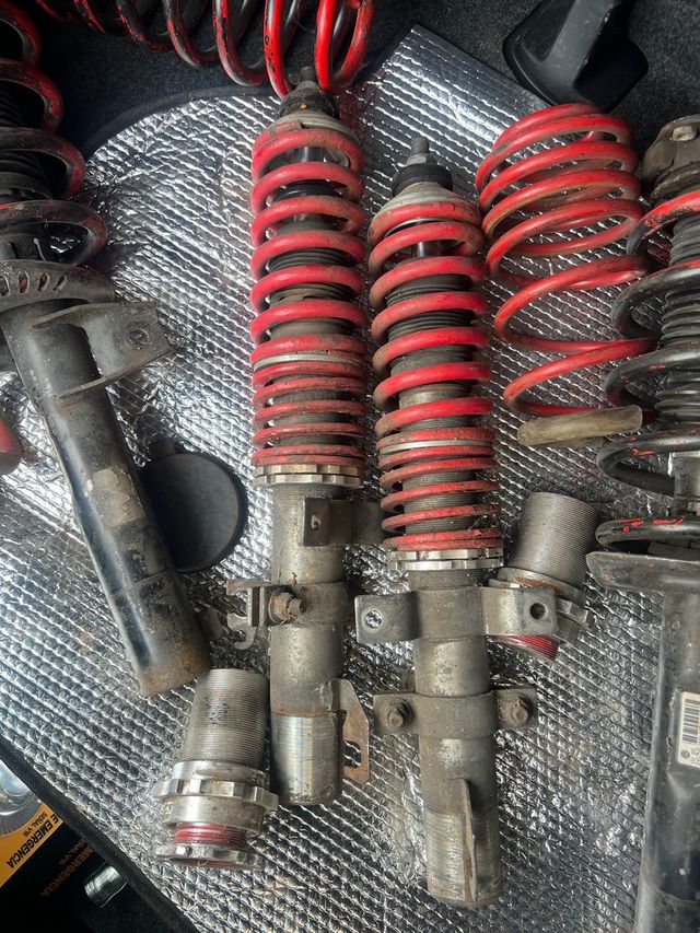 Conjunto de amortiguadores y suspensión roscada. - Resortes de color rojo. - Componentes metálicos.