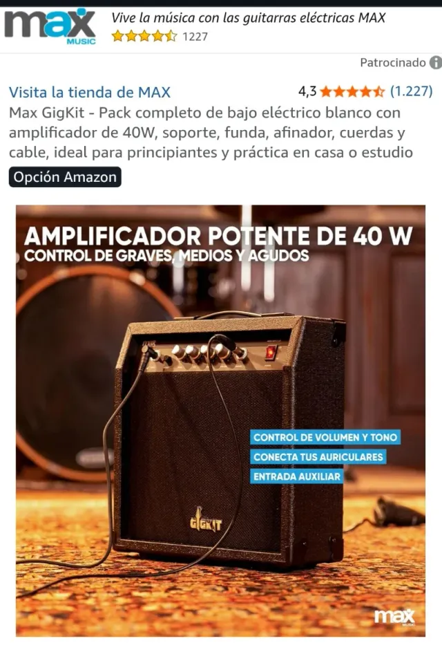 Detalles del productoAmplificador de bajo eléctrico MAX GigKit de 40W, ideal para principiantes. Incluye control de graves, medios y agudos, además de conexión para auriculares y entrada auxiliar.