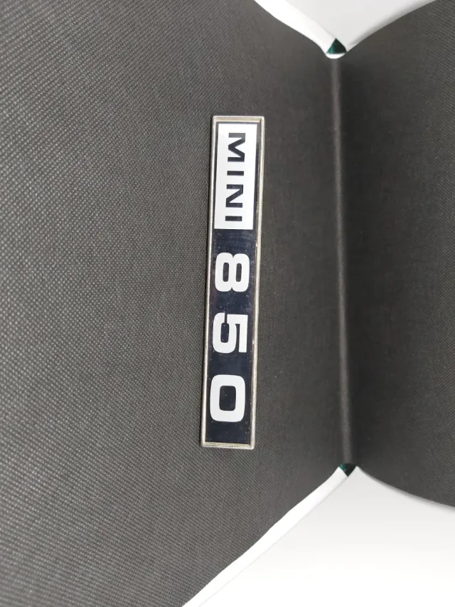 Anagrama metálico para Mini Morris 850. - Diseño clásico. - Acabado plateado y negro.