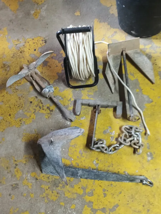 Conjunto de anclas para embarcaciones, incluye cabo y cadena.Precio según ancla. - Ancla plegable. - Ancla de arado. - Cadena de eslabones. - Cabo de amarre enrollado.