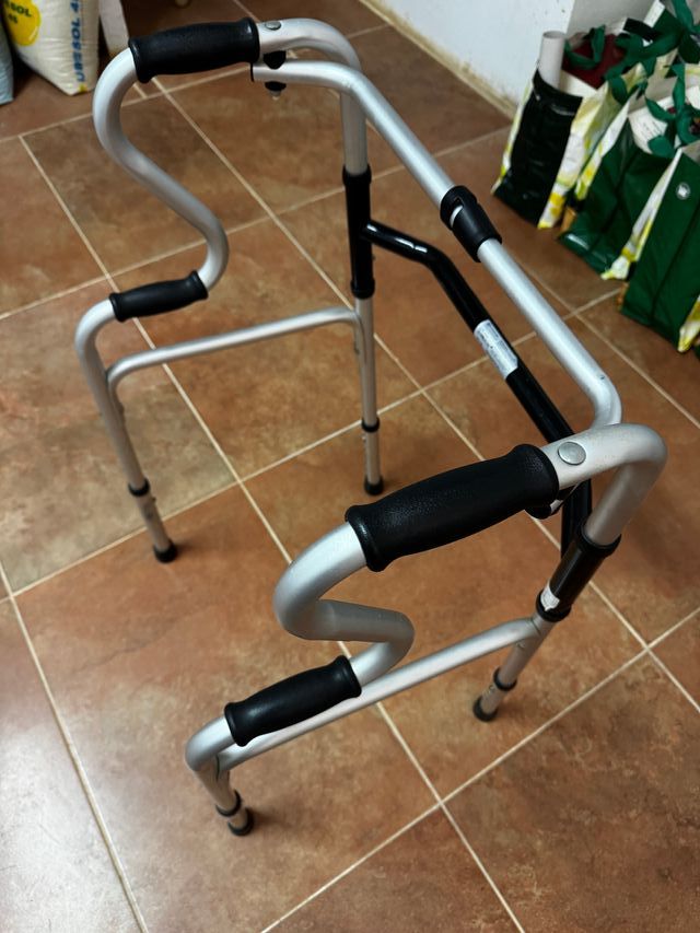 Andador ligero y plegable, ideal para adultos. Su diseño permite un fácil almacenamiento y transporte. - Fabricado en aluminio. - Altura regulable.