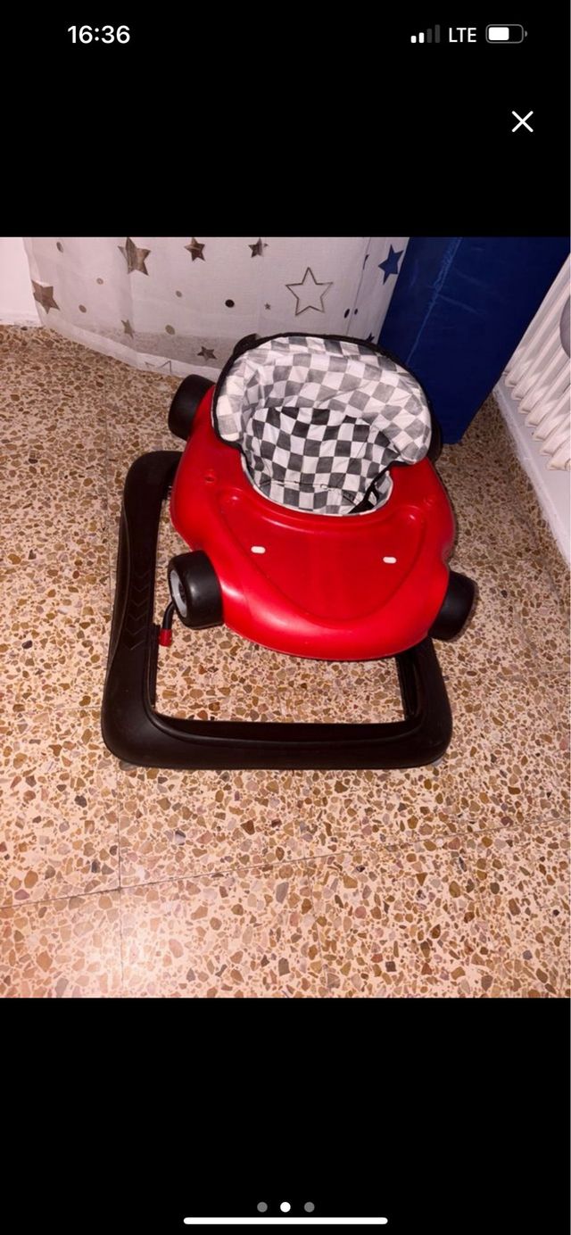 Andador para bebé con diseño de coche. - Color rojo. - Asiento con estampado de cuadros.