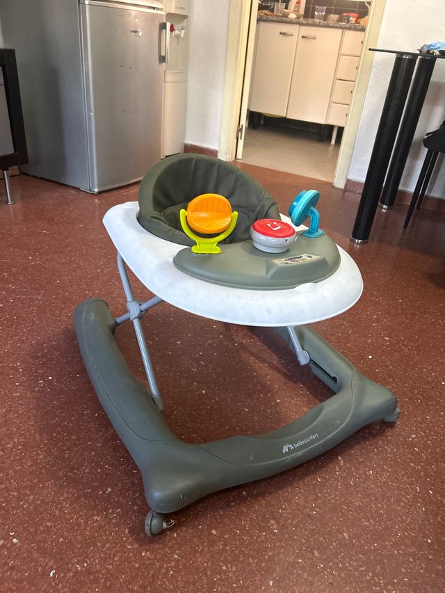 Detalles del productoAndador de la marca Bebeconfort en color blanco y verde cacería. Cuenta con un asiento acolchado y varios juguetes.
